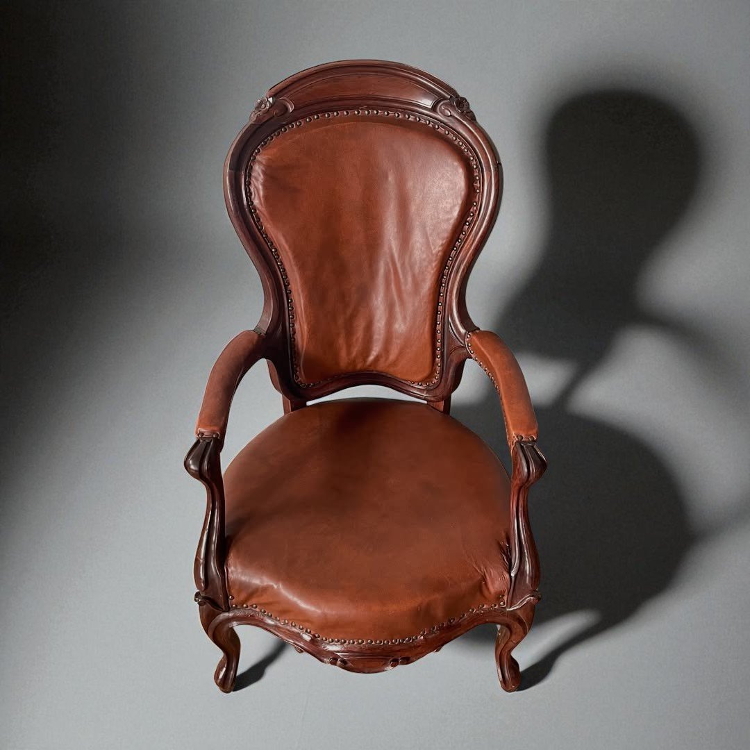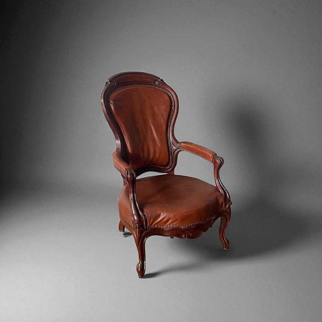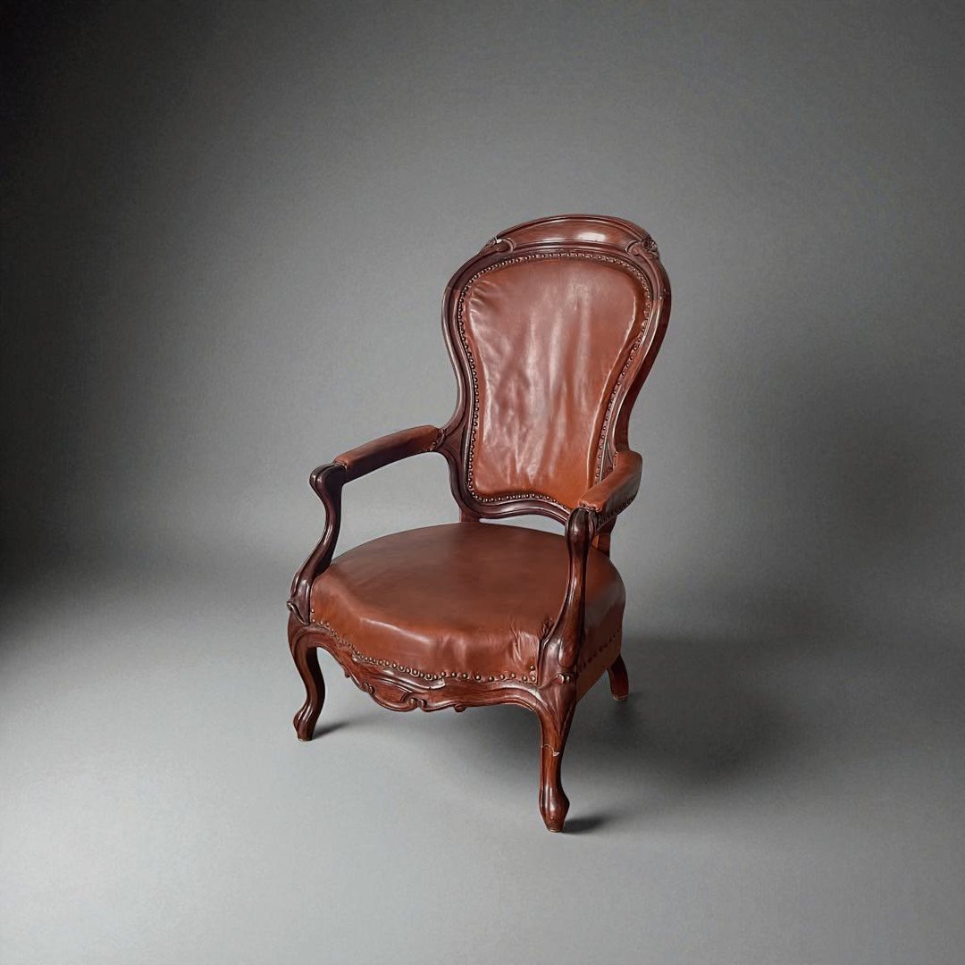 A Louis XV style armchair, known for its elegant design and curved lines. It features a wooden frame with carved details and is upholstered in brown leather, finished with brass studs. The chair’s cabriole legs and rounded back contribute to its classic, refined appearance.