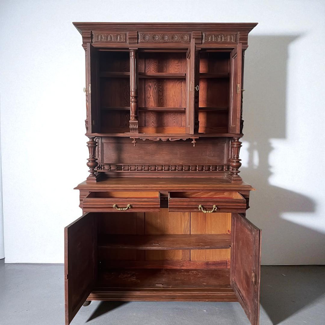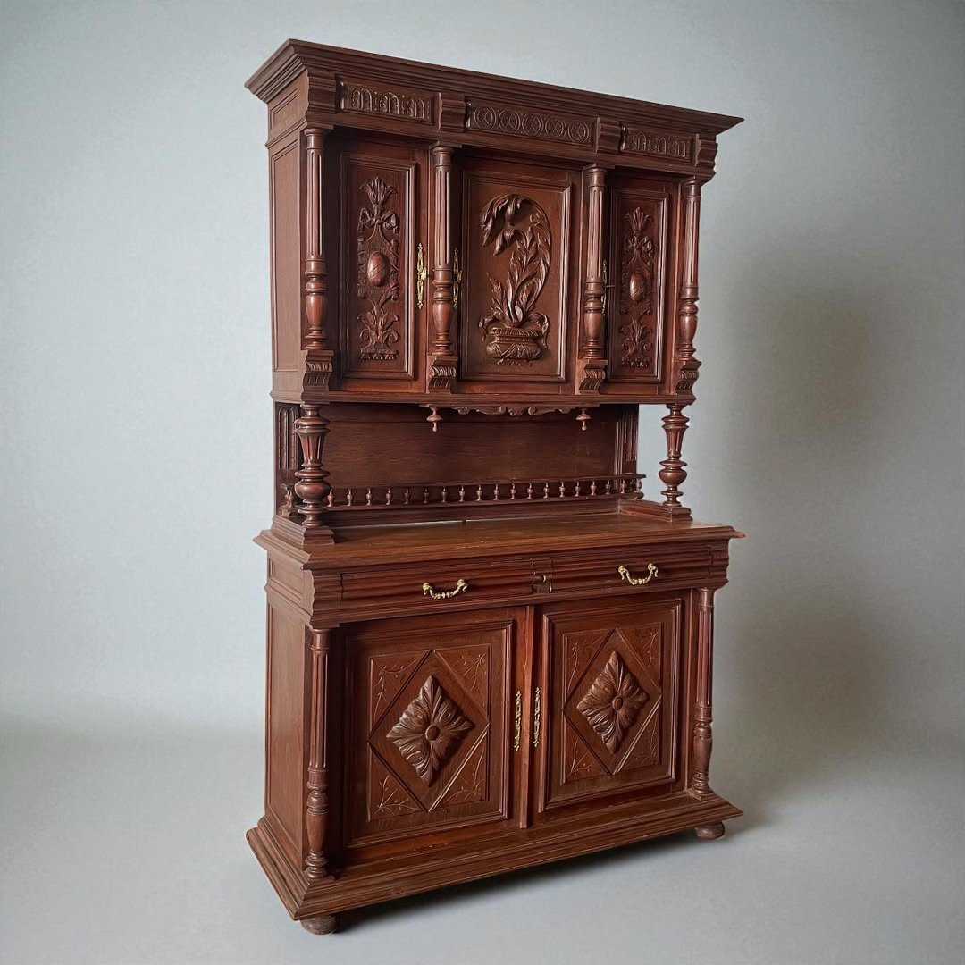 A French Henri II style oak buffet or hutch, the stepped upper section with a molded cornice, supported by fluted columns and carved corbels. The central door features a prominent relief carving, below the upper cabinet, an open section with a plate rail provides additional display space. The base features two cabinet doors with carved panels, diamond-shaped or geometric patterns, and brass hardware including handles and escutcheons.